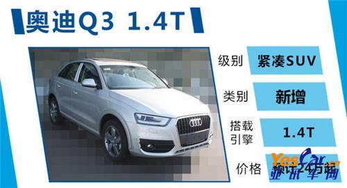 2013年在华共计销售新车488,488万辆,实现了同比21.2%的增长。对于核心市场,奥迪首席执行官施泰德先生表示:“中国市场是世界上第一大单独的汽车市场,它有每年2000万辆潜在的销量,可以说这是在我们的经营历史中,赢得的人数最多的客户群体。”今年将导入多款新车,其中小排量化的新车将成为重点。近日从一汽-大众奥迪官方获悉:奥迪今年将在中国市场推出国产Q3的1.4T版本。与此同时国产Q3的1.4T车型共有两个版本,分别为手动挡与自动档,其中前者有望将Q3的入门级售价拉低至24万元左右。
